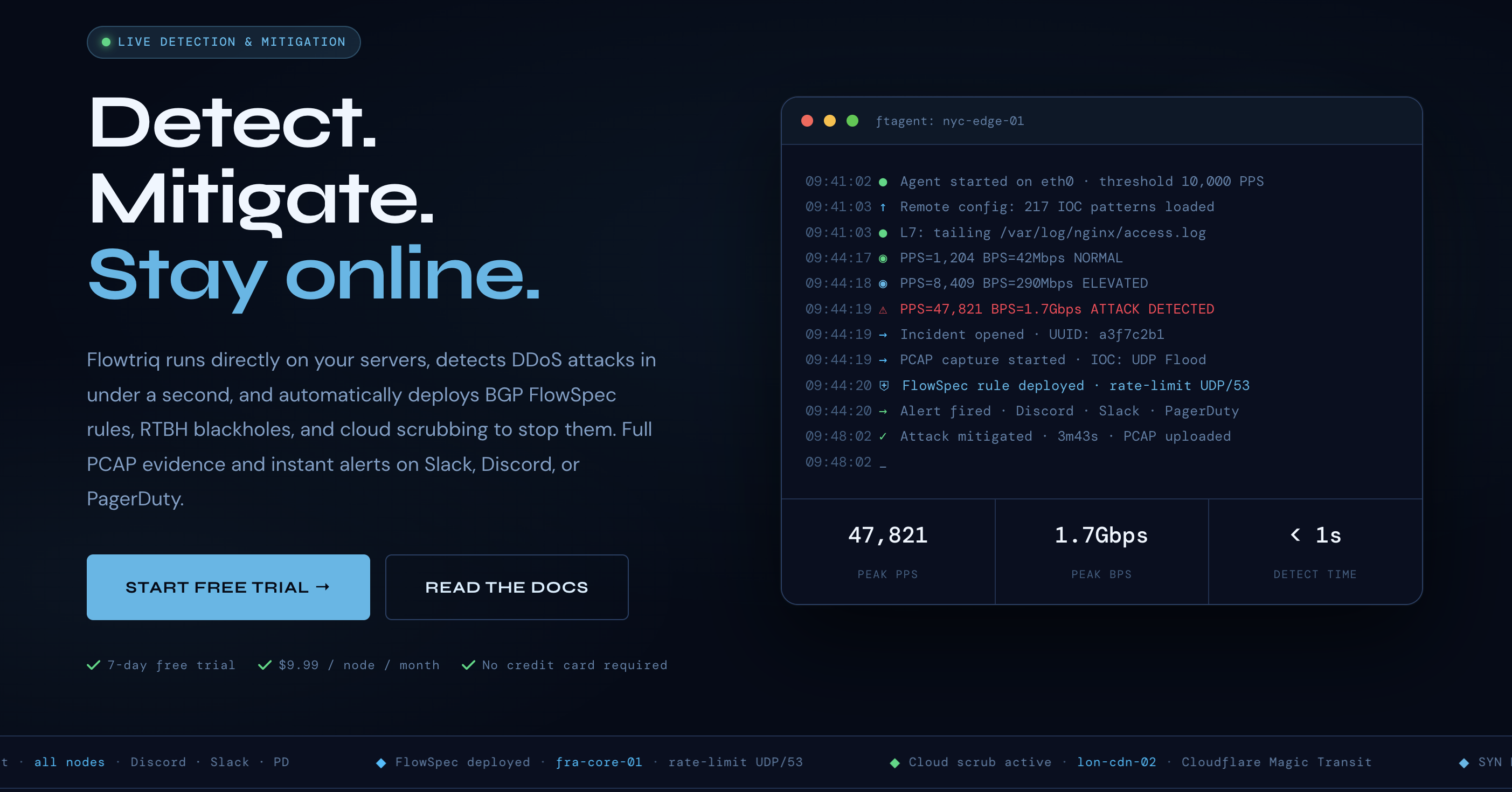 - - Sub-second, on-host precision for modern workloads. Flowtriq’s agent (ftagent) inspects packets directly on Linux NICs and checks PPS every second, enabling detection and mitigation in <1s across 8+ attack types (from SYN/UDP floods to L7). Compared to Cloudflare Magic Transit, which operates upstream, Flowtriq’s host-level PCAP and IOC pattern matching (642,000+ indicators) provide developer-friendly forensics and fine-grained classification at the point of impact.